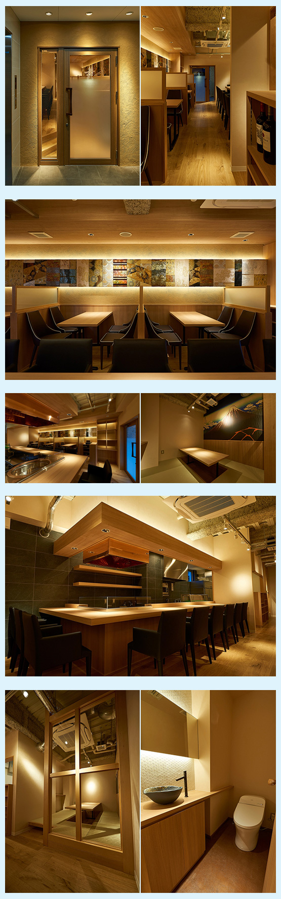 ・焼き場の臨場感を楽しめる、カウンター中心に構成した和の店舗空間。